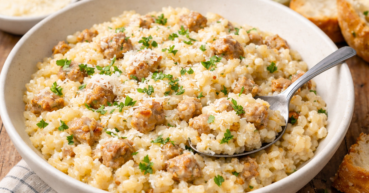 Try out our Italian Chicken Sausage Risotto recipe today! This dish features creamy arborio rice slowly cooked with savory chicken sausage, broth, and Parmesan cheese.