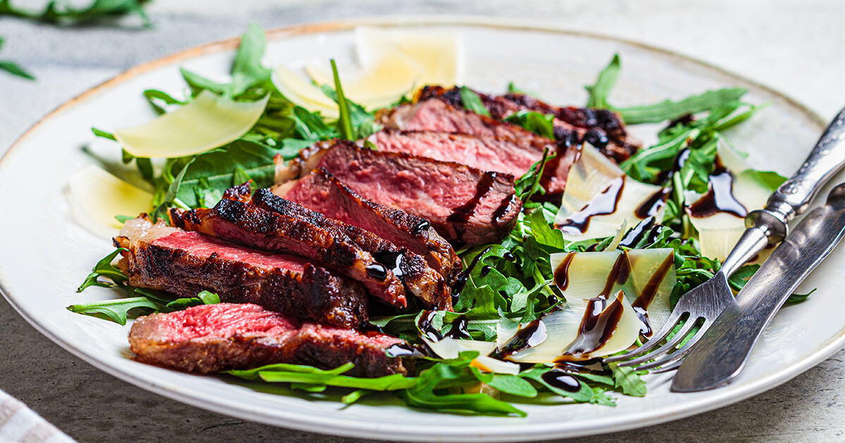 Try out our Italian Sliced Steak with Arugula & Parmesan recipe today! This dish features tender New York strip steaks sliced over arugula and topped with shaved Parmesan, olive oil, and balsamic.