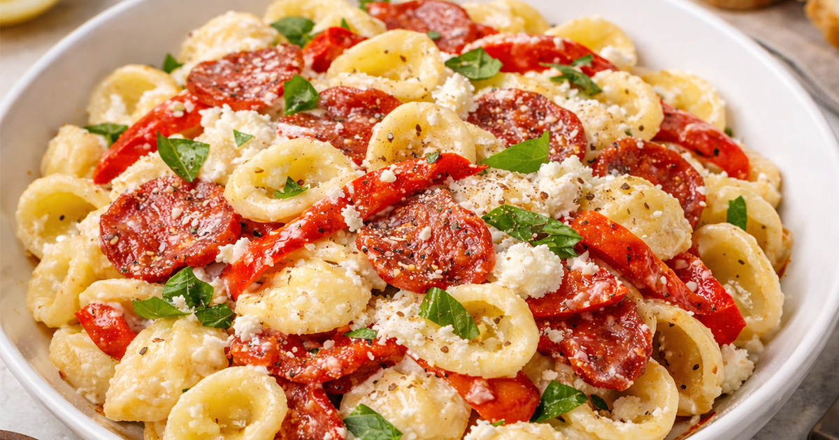 Try out our Sopressata & Ricotta Orecchiette recipe today! This dish features tender orecchiette tossed with crispy sopressata, sweet roasted red peppers, creamy ricotta, sharp Pecorino, and a bright hint of lemon zest.
