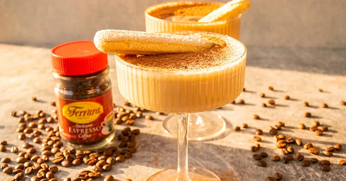 - Strain into chilled martini glasses, letting the surface settle. Finish with a light sprinkle of chocolate shavings on top and rest ladyfingers on the rims for a classic tiramisu-inspired touch.