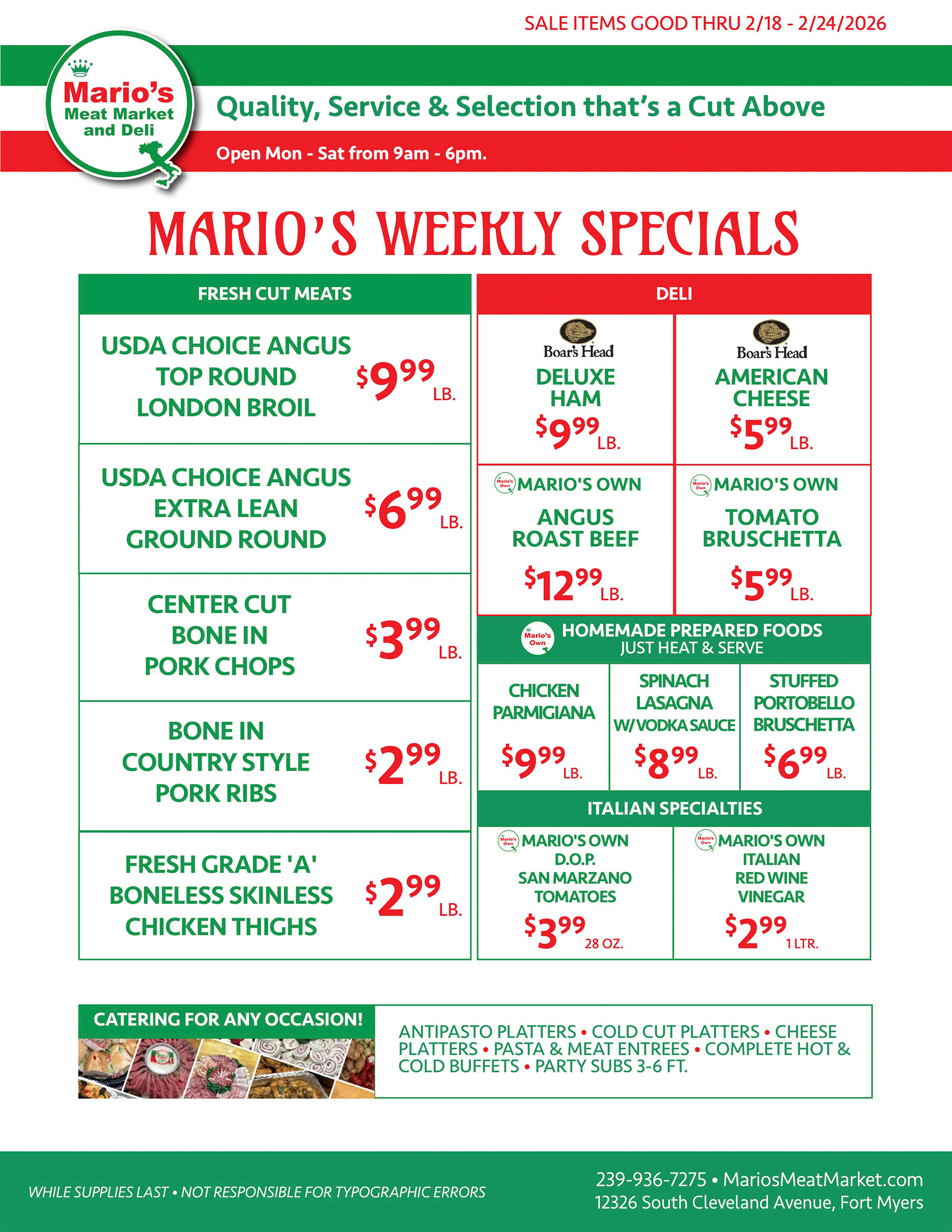 Weekly Specials Fort Myers | Wednesday, February 18th through Tuesday, February 24th| Marios Meat Market and Deli